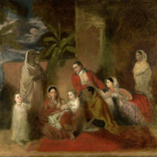 Painted by Francesco Renaldi in 1786, The Palmer Family depicts Major William Palmer (seated in the center) surrounded by his two bibis, children, and female servants. Bibis are common-law wives of British men in India. Seated to Palmer's left is Bibi Faiz Bakhsh. She is holding one of Palmer's children, a sleeping baby boy named Hastings.