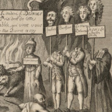 Reflecting French Revolutionary sentiments, the image points out the destruction of the nobility, depicting the arrival in Hell of a "marquis" and several other "aristocrats," described in the legend as "conspirators" and "traitors."